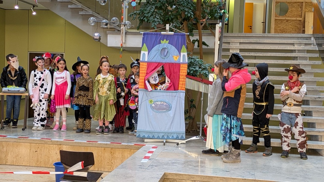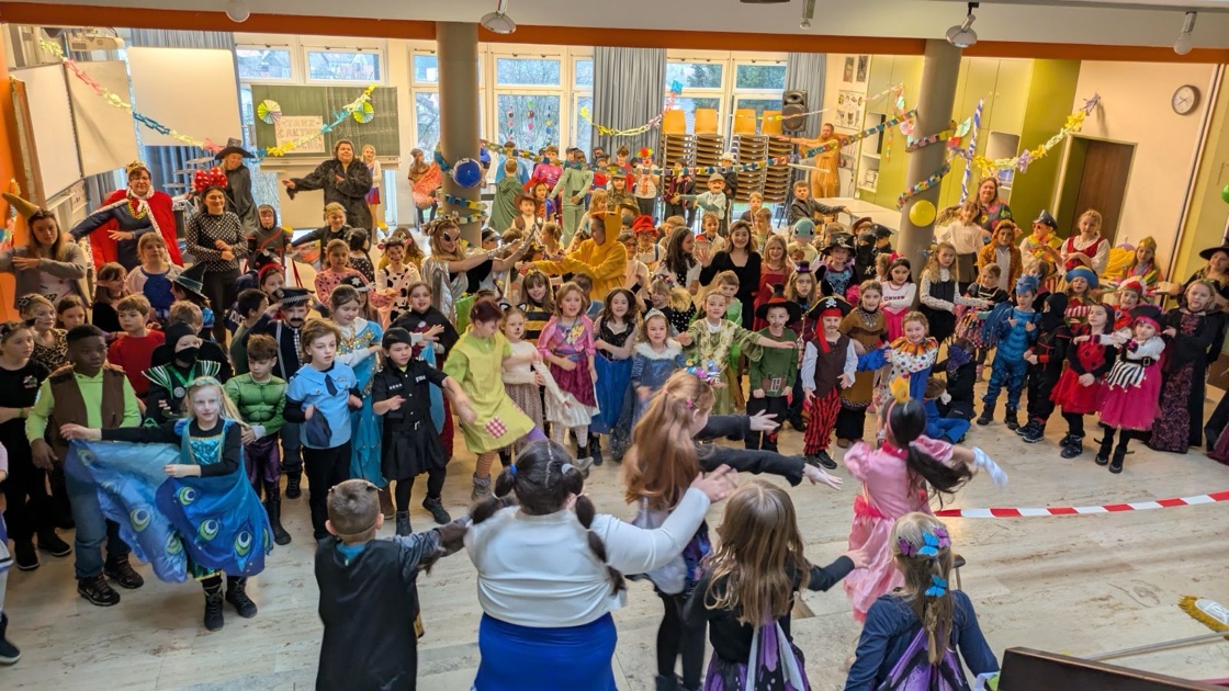 In der 3. und 4. Stunden stieg die große Faschingsparty im Musiksaal. Zuerst sorgten zwei tolle Auftritt der Tanz-AG und des Chors bei allen für gute Stimmung. Anschließend wurden die verschiedenen Stationen geöffnet: Die Kinder stellten ihr Können beim Dosenwerfen oder im Schnelligkeits-Parcours unter Beweis, an der Fotostation entstanden lustige Schnappschüsse und beim Basteln konnte man sich kreativ ausleben. Die ganze Zeit wurde zusammen getanzt und gelacht.
