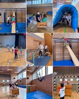 In der Gemeindeturnhalle wurden die Erstklässlerinnen und Erstklässler mit einer winterlichen Bewegungslandschaft gefordert, die ihnen sichtlich viel Freude bereitete.